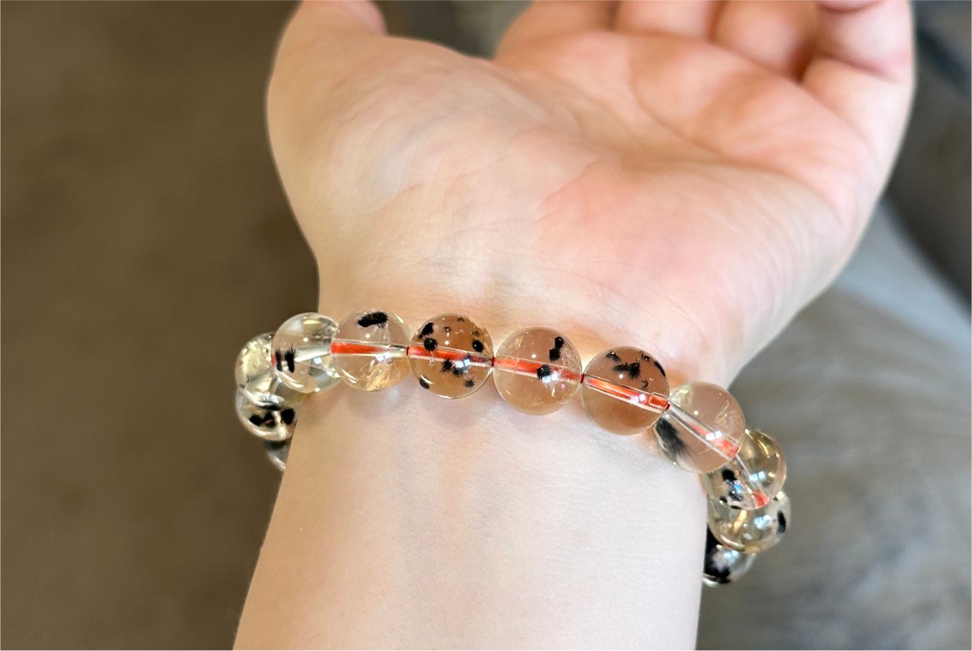 This is a rare, very high-quality Citrine Hollandite Quartz bracelet. It contains a clearly visible and substantial amount of hollandite inclusions in complete “sea urchin” shapes, set within transparent Citrine. The piece features significantly fewer ice cracks than usual—this level of quality is very hard to come by.