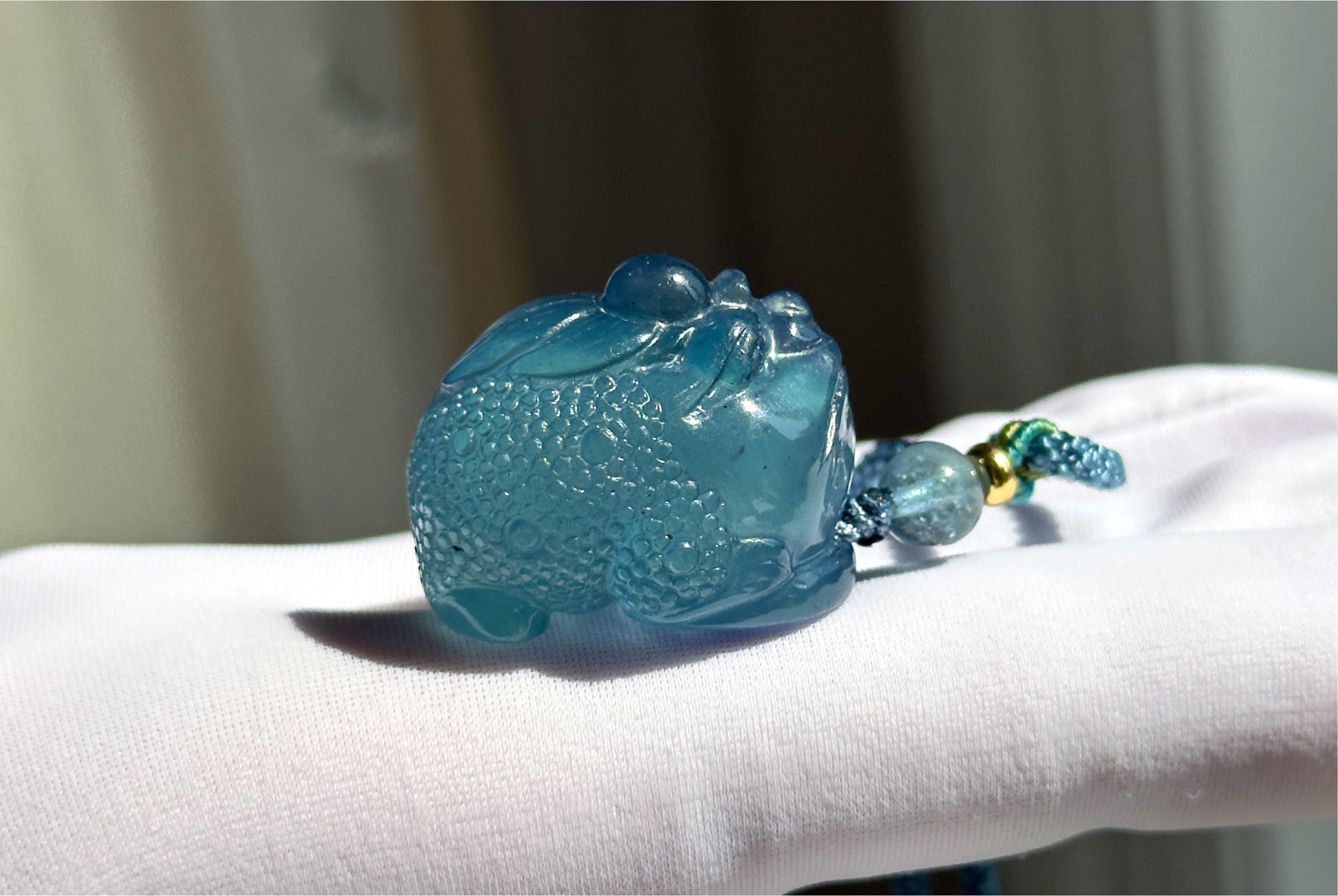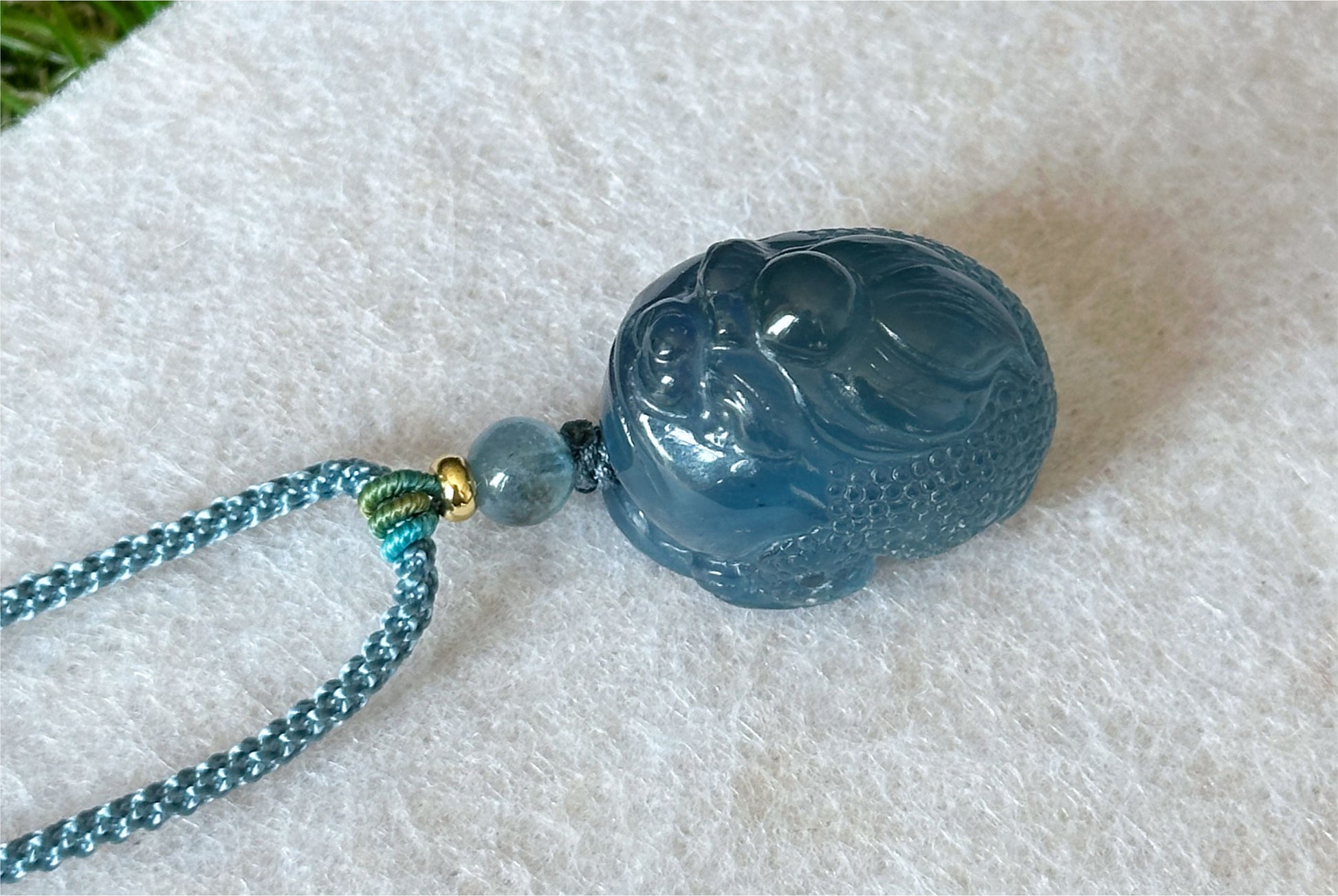 This pendant features a hand-carved money toad crafted from natural deep devil blue aquamarine, known for its rich, vibrant color. The carving is full and well-proportioned, There will be slight natural cotton-like inclusion.