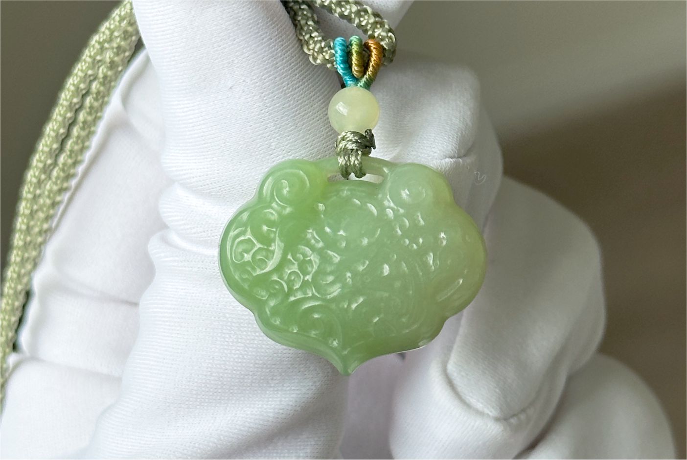 Certified Natural Emerald-Green and Qing Shui Nephrite Jade Peace Lock Pendant | 天然晴水带翠软玉雕刻平安锁吊坠